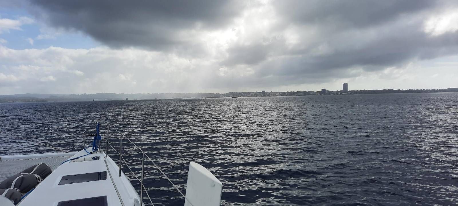Haben am Dienstag in Denarau abgelegt und sind in den Süden der Insel aus dem geschützten Atoll raus und voll in die ziemlich hohe und heftige Pazifik Südostwelle mit ziemlichen Böen hineingefahren. Beiliegend ein kleiner Eindruck der Rauschefahrt. Haben daher die erste Nacht mal in einer Bucht im Süden der Insel Viti Levu verschnauft.
