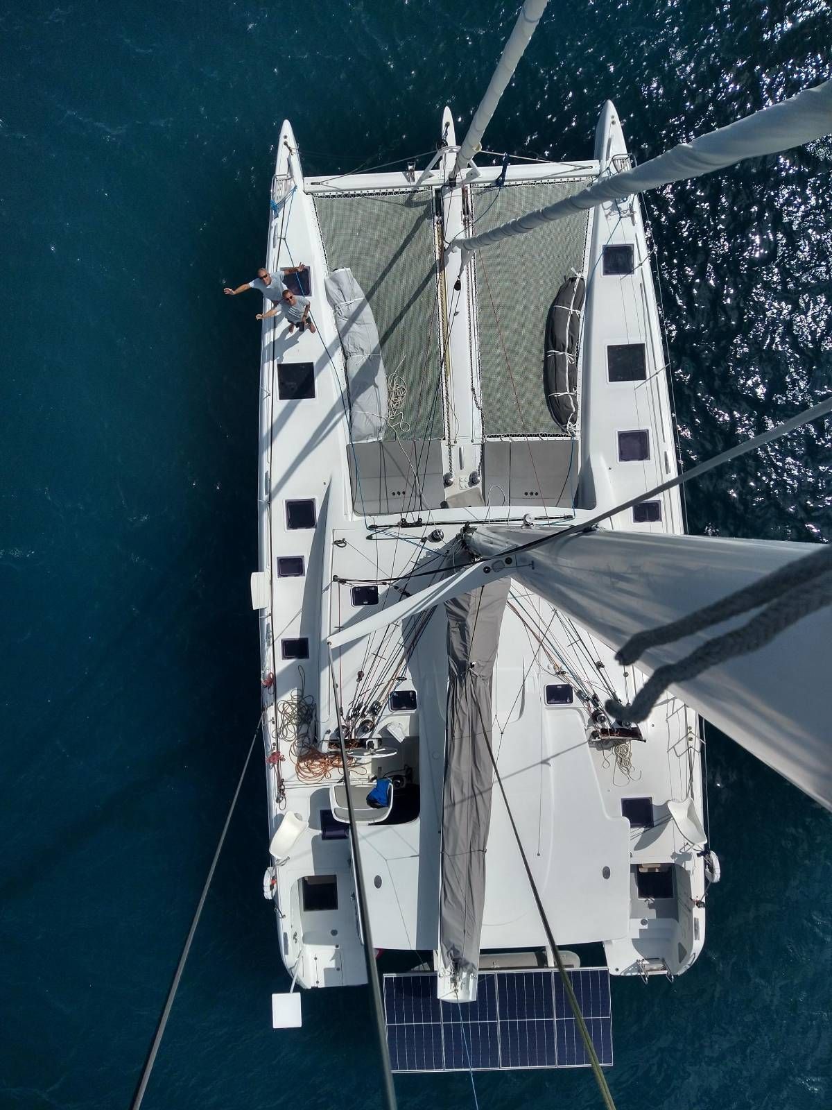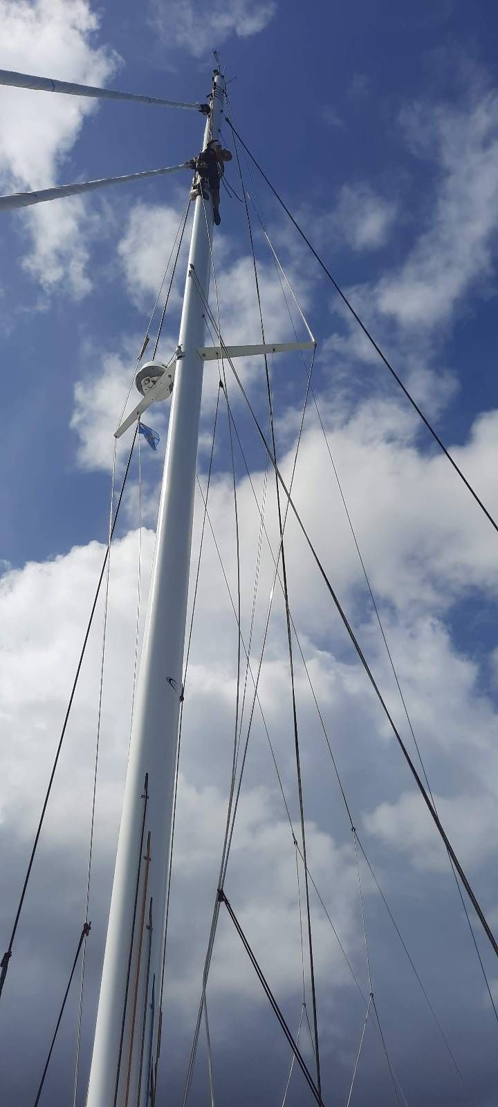 Der zweite Tag verlief nicht minder heftig – da ging dann auch die Naht am Achterliek (Hinterer Rand) des Vorsegels auf. Also wieder zurück auf die Hauptinsel da wir nicht unbedingt selber nähen wollten 😃. DIe Nacht wieder in einer Bucht ein Stück westlich von Suva der Hauptstadt von Fiji verbracht. Am Morgen einen schönen Sonnenaufgang gesehen und gleich weggefahren um das Segel zum Segelmacher zu bringen. Doch vorerst musste es runtergebracht werden – es hat sich oben verhängt – da war Klaus gefragt der behende in den Mast geturnt ist und in 10min war es herunten. Für die Übung hatte er den Genuss eines schönen Ausbliocks auf das Schiff und die Hauptstadt.