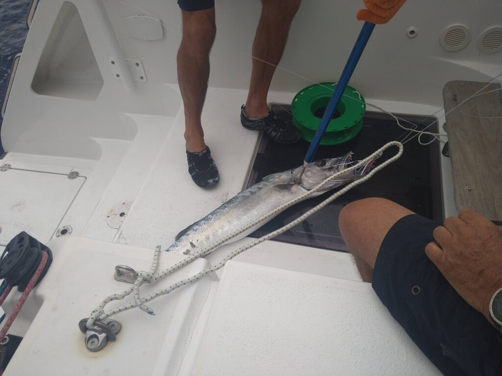 Ein großer Barracuda. Da haben wir dann arbeitsteilig gearbeitet: Klaus hat ihn mit Hilfe von Sepp rausgeholt und ausgenommen. Ich habe ihn dann zerlegt und filetiert und Sepp hat ein paar Sashimi und eine gute Suppe gemacht.