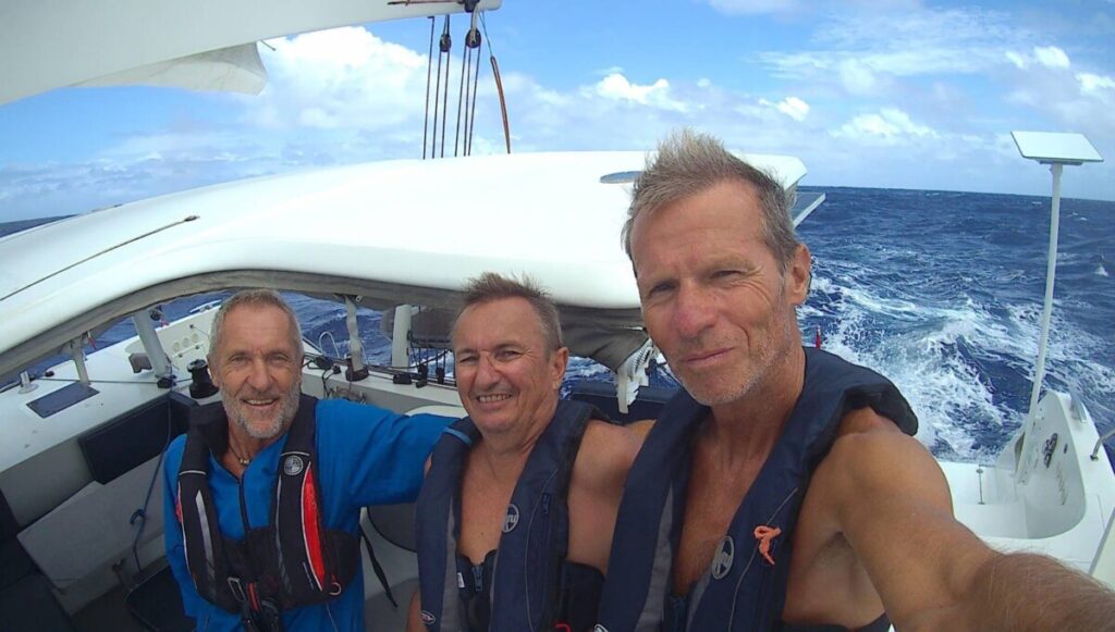 Hi – ich gleich wieder… wir haben noch ca. 150 sm bis Maupihaa und es ist 3h nachmittags – bei diesen Bedingungen kommen wir aber nur verhältnismäßig langsam unserem Ziel näher – voraussichtlich werden wir das nicht in 24h schaffen wie es sonst überhaupt kein Problem wäre… Werden also insgesamt noch 1 Tag und 2 Nächte brauchen bis wir wieder entspannen können. In der Nacht können wir nicht in den Pass einfahren – der ist sehr schmal und schon bei Tageslicht eine Herausforderung. Einziger Lichtblick – der Höhepunkt des Windes (bis zu 30kn in den Böen – wir haben schon das 3. Reff im Groß) sollte ungefähr um Mitternacht – also in ca. 10h überschritten sein. Da die Wettervorhersage so kurzfristig ziemlich genau ist können wir damit auch wirklich rechnen.. Wellen – so um die 4m werden uns allerdings noch weiter begleiten – die dauern bis sie sich wieder abbauen. Heir ein paar Bilder die uns nach dem Reffen zeigen – schauen entspannt aus – aus – nur in den Haaren sieht man den Wind. – ist schwierig diese Bedingungen festzuhalten!